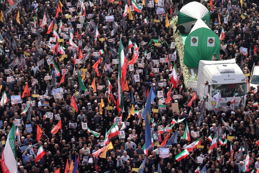 Mourners carried portraits of Khamenei and the late Supreme Leader Ayatollah Ruhollah Khomeini, waved flags, and surrounded the trucks carrying flag-draped coffins. Armed guards were seen stationed on rooftops overlooking the massive procession.