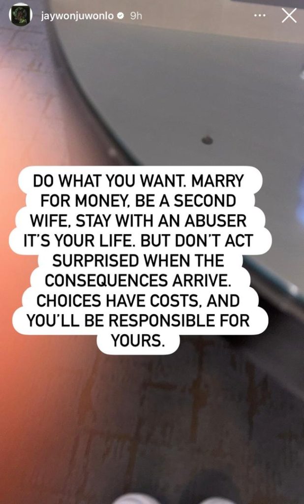 Singer, Jaywon, has warned Nigerian women who choose to marry for money and become second wives. to prepare themselves for the ‘consequences of their action.’