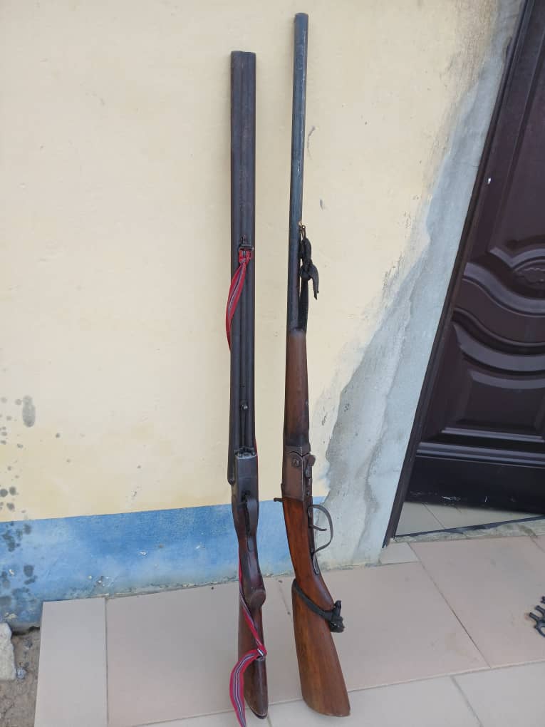“Follow-up investigation led to the arrest of Zachariah Okeh (male, 36), alleged to be an Eiye cult leader in Aviara. During a execution of a search warrant at his residence, officers recovered one locally made double-barreled gun, one locally made single-barreled gun, and six live cartridges.”