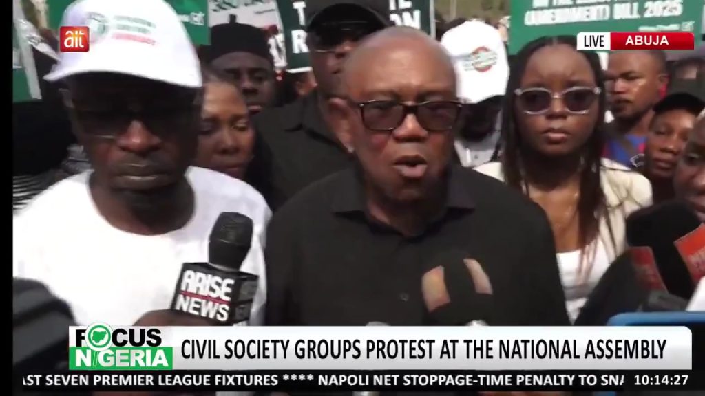 Former Labour Party presidential candidate, Peter Obi, on Monday, Feb. 9, joined hundreds of protesters at the National Assembly Complex in Abuja to protest the Senate’s decision to remove “real-time” electronic transmission of election results from the Electoral Act Amendment Bill.