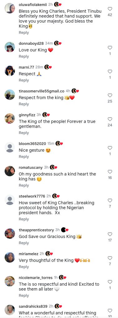 Again, as they crossed the sandy area of the courtyard, King Charles reached his hand out to support Tinubu.