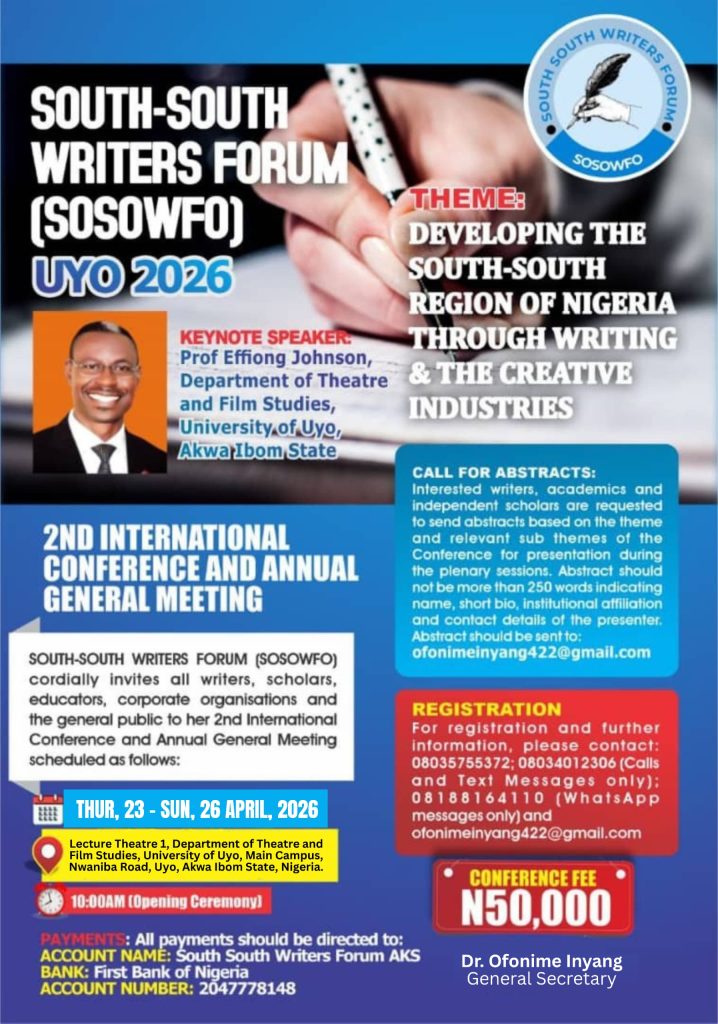 The Association of South South Writers Forum (SOSOWFO) will hold its 2nd International Conference and Annual General Meeting from Thursday, 23rd to Sunday, 26th of April, 2026, in Uyo, the capital of Akwa Ibom State